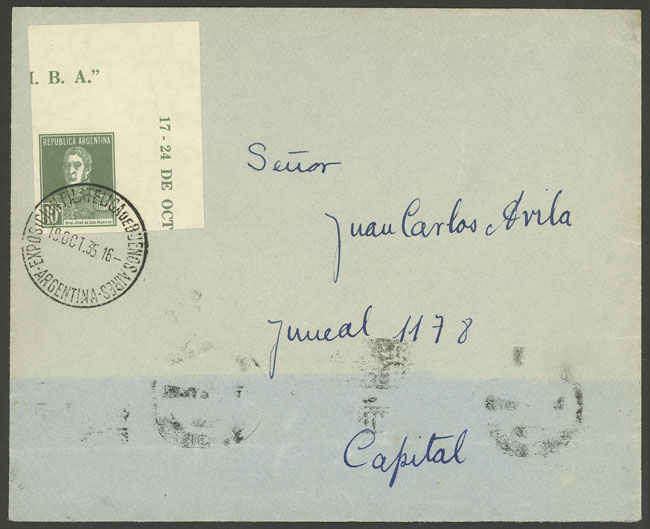 stamp from the souvenir sheet HB 1, franking a cover sent from the Buenos Aires Philatelic Expo on 19/OC/1935 (Image)