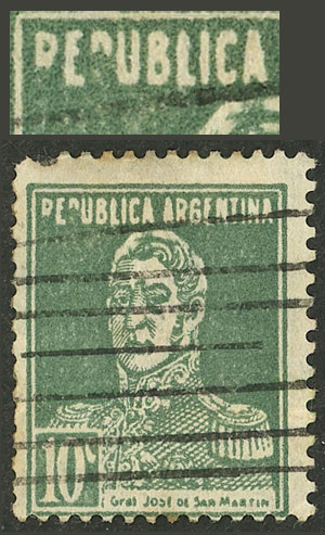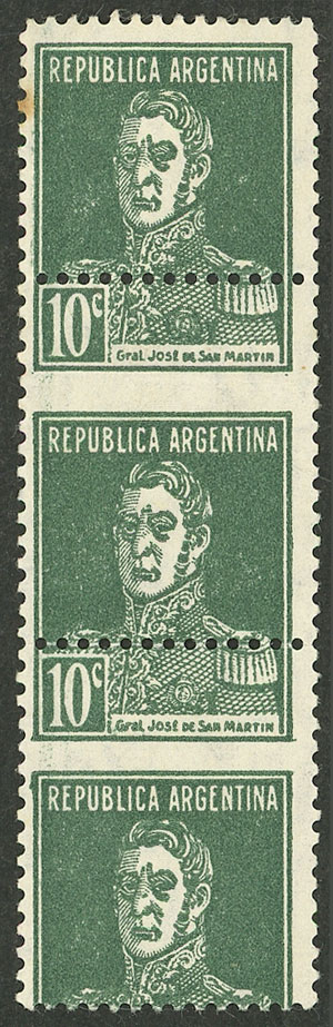 10c. San Martín, typographed, strip of 3 with VARIETY: horizontal perforation very shifted (catalog value of a normal strip US$22.50), rare (Image)
