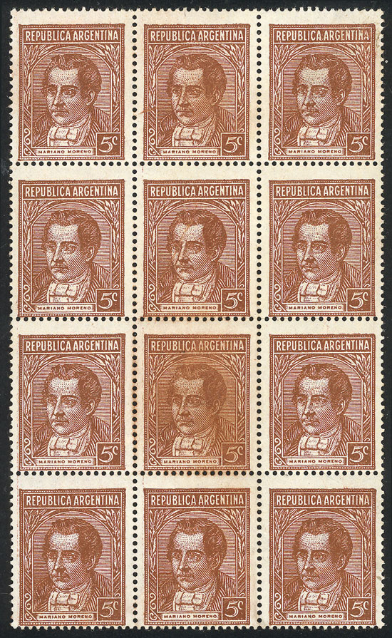 block of 12, the central stamps with VARIETIES due to excess ink, light staining (Image)