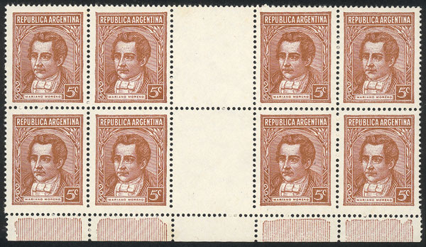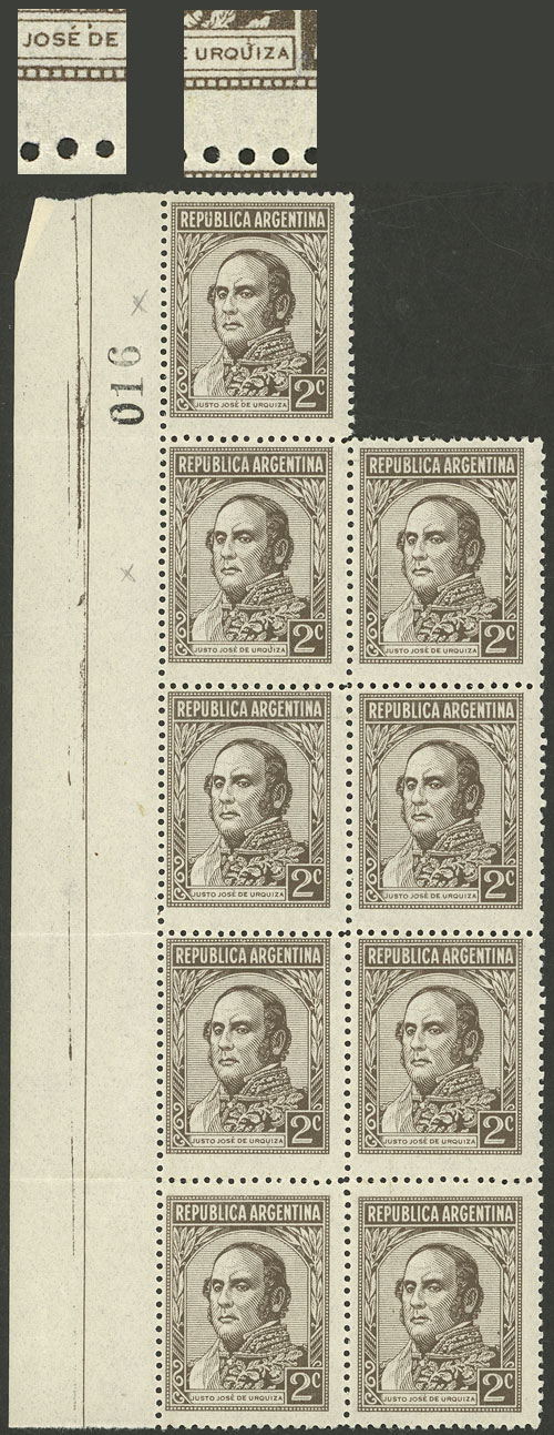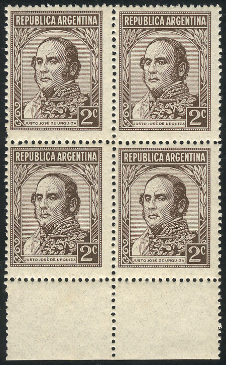 corner block of 9, 2 with VARIETIES: dot above the "D" of DE (pos.31) + dot above the second "U" of URQUIZA (pos.41) (Image)