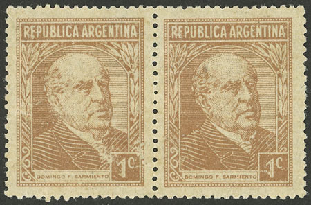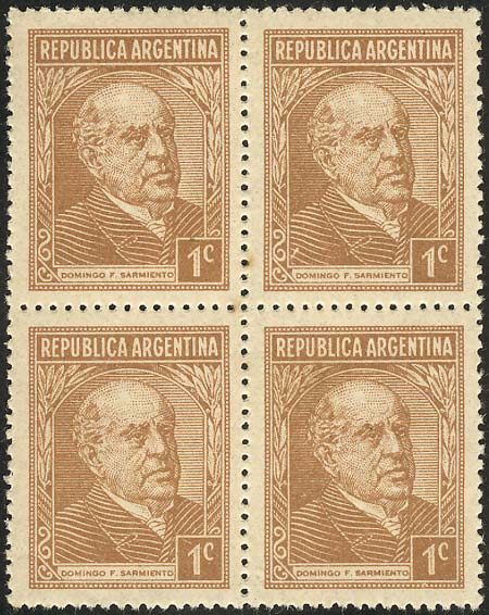1c. Sarmiento, unwatermarked, block of 4 with RARE ribbed gum (it is not ribbed paper), with stain point, interesting! (Image)