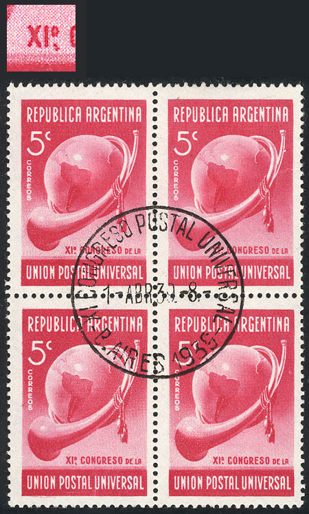 block of 4 with first day postmark, one with VARIETY: "XI°" with double period (pos.56) (Image)