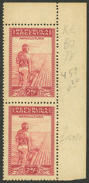 corner pair, the lower stamp with VARIETY: Plowman with face mask, the stamps also have shifted impressions resembling a double impression (Image)