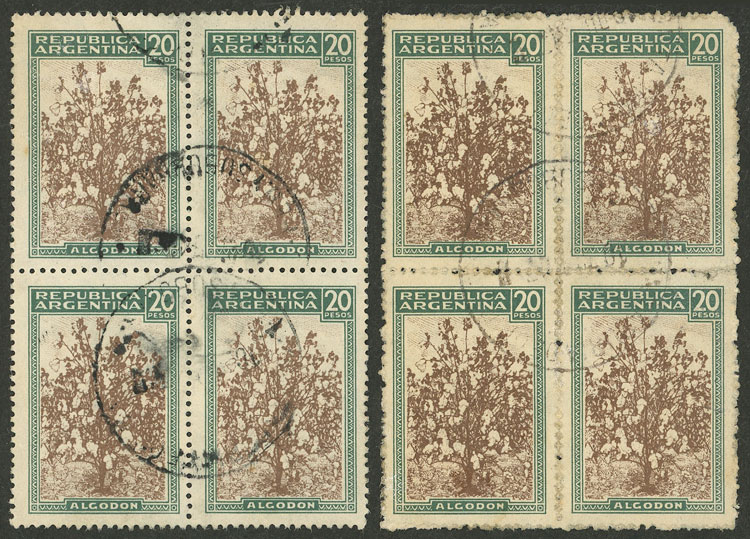 $20 Cotton, blocks of 4 printed on paper without watermark with compact pattern + Canadian paper (Pettigiani catalog value US$72) (Image)