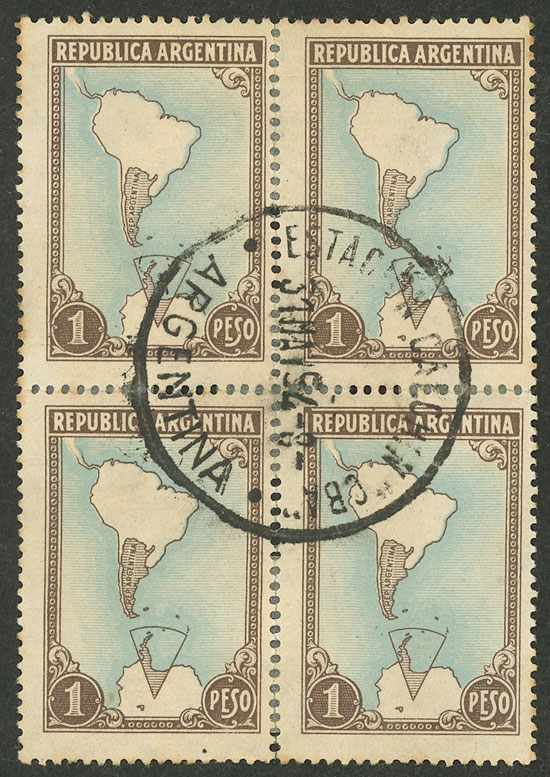 block of 4, reinforced with hinges, with postmark of "ESTACIÓN CALCHIN" (Córdoba) of 31/MAY/1954 (Image)