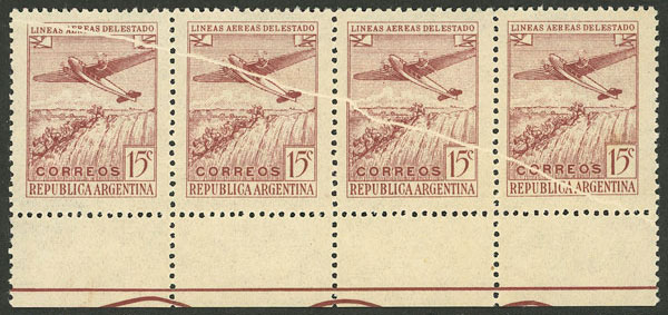 Airplane, marginal strip of 4, with VARIETY: Fold across the 4 stamps (Image)