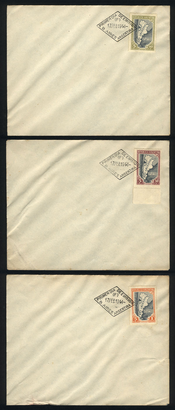 GJ.912/914, San Juan earthquake victims, 3 values of the set on first day covers, one cover with minor defects. (Image)