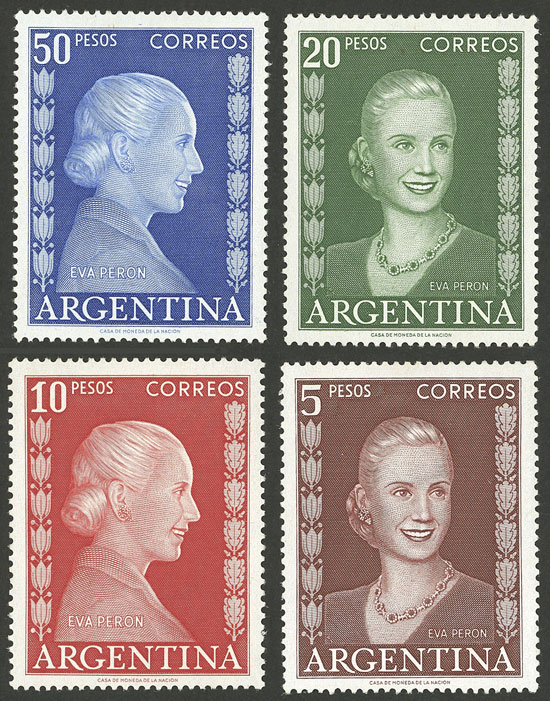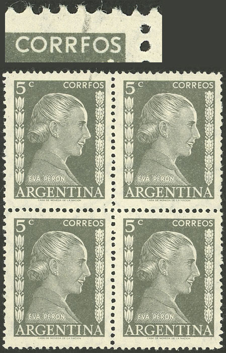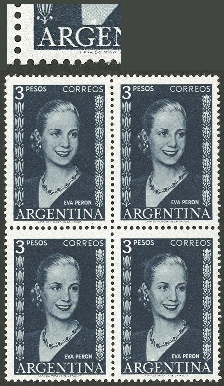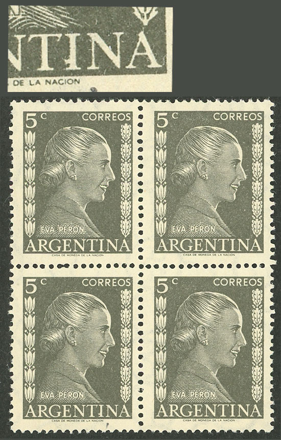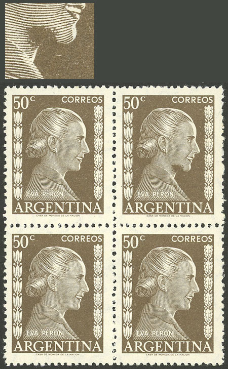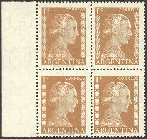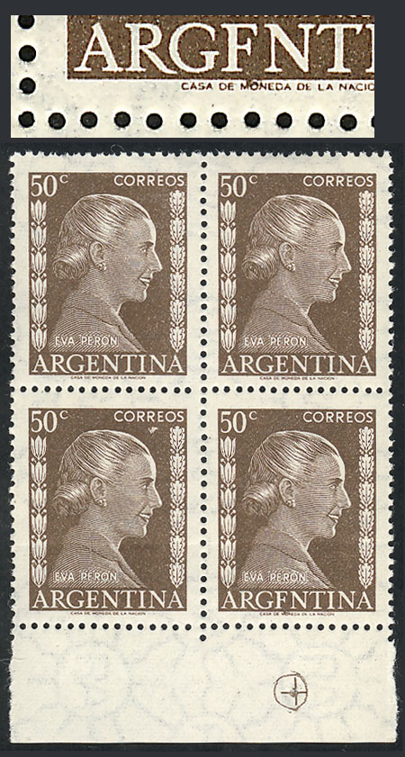 50c. Eva Perón, marginal block of 4, one with "ARGFNTINA" variety, excellent (Image)
