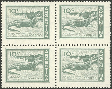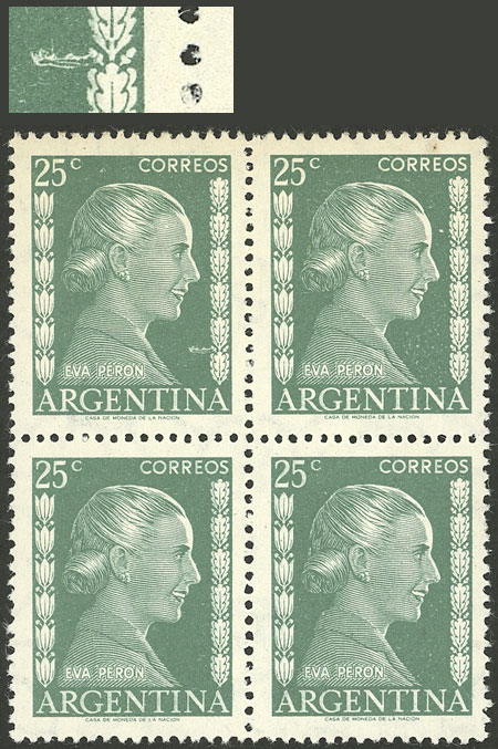 block of 4, one with VARIETY: white spot above "GE" of ARGENTINA (Image)