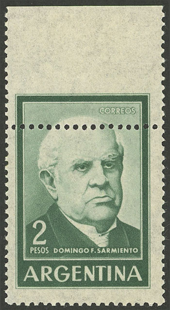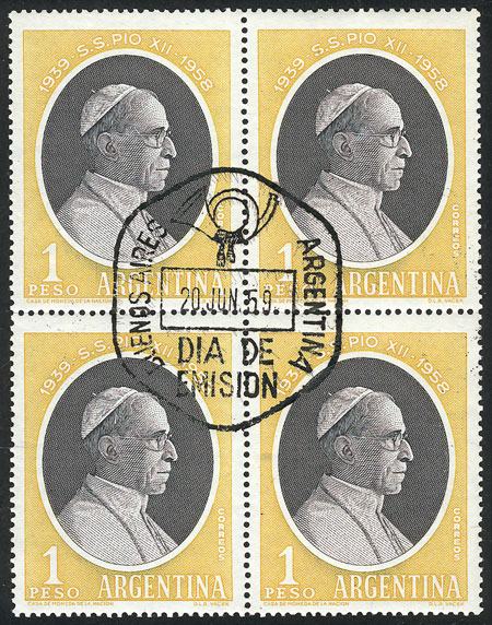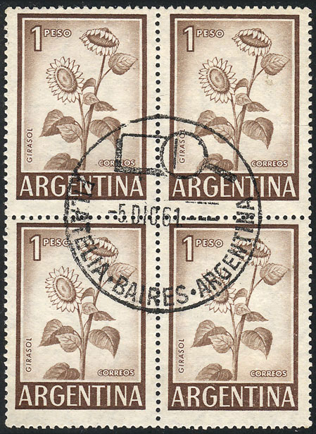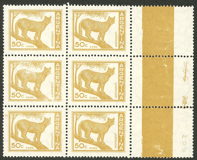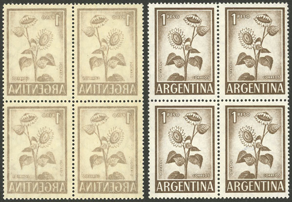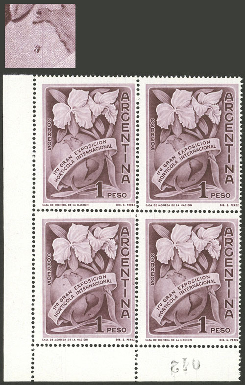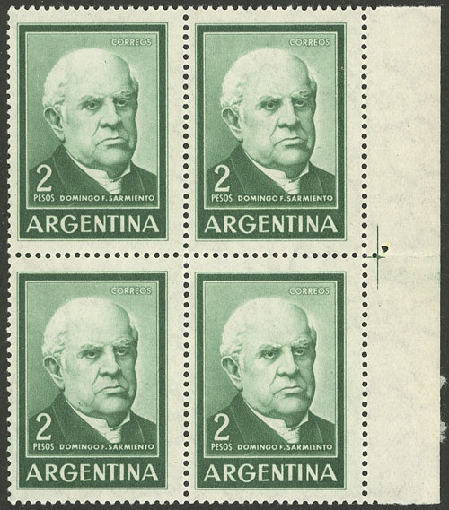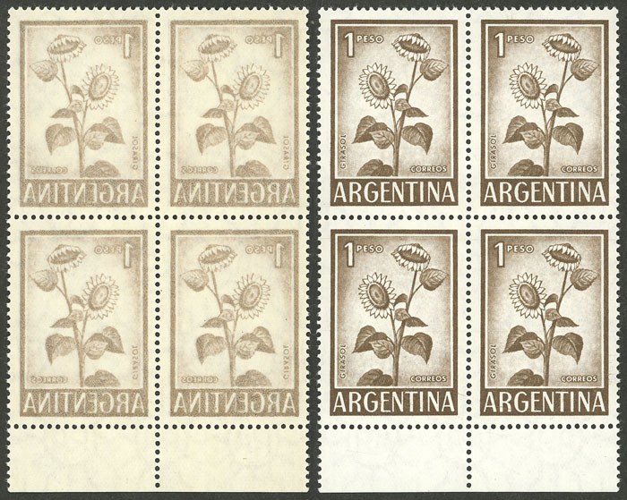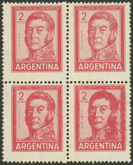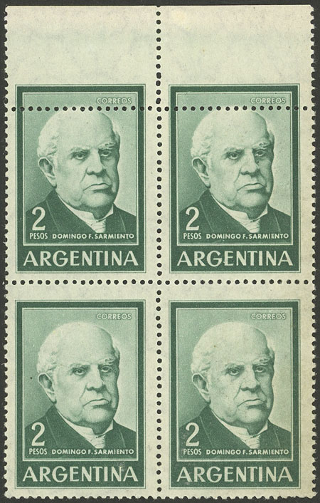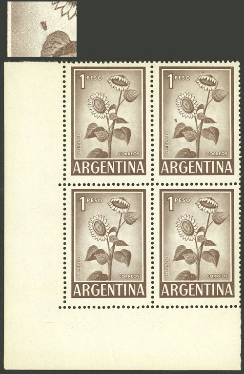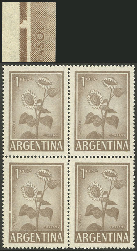 marginal block of 4, the top stamps with VARIETY: without "CORREOS" due to shifted perforation (Image)