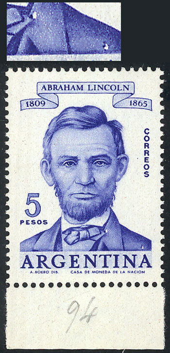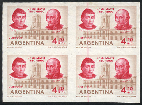 imperforate block of 4, PROOF in rose and brown, the right stamps with VARIETY: vertical color line, VF! (Image)