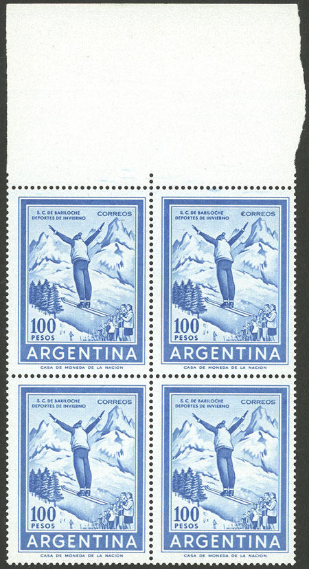 GJ.1148B, Skier, marginal block of 4 printed on national glazed paper, VF (Image)