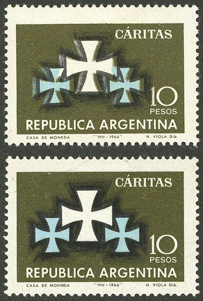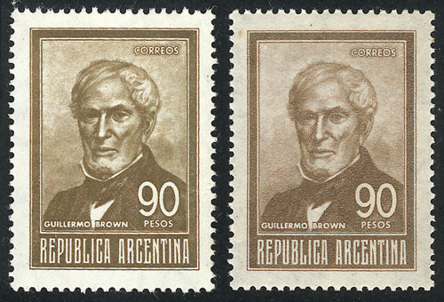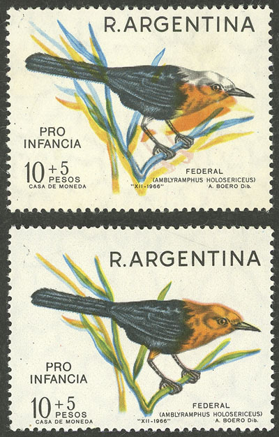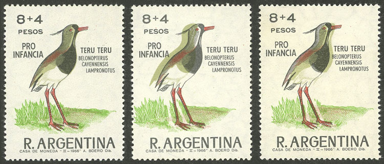 Bird, with VARIETY: Gray shifted to the left (MNH)+ to the right (light staining on the gum), along a normal example (Image)