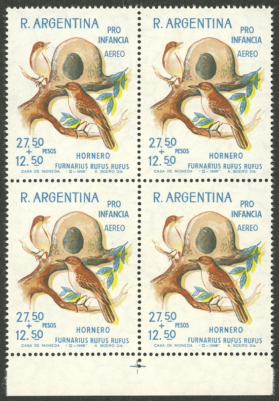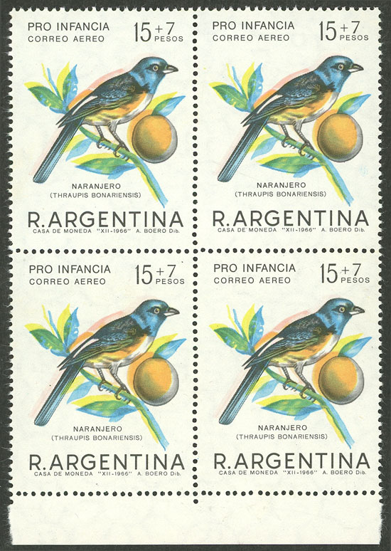 Birds, marginal block of 4, VARIETY: very shifted colors, appears to be a double impression, VF (Image)