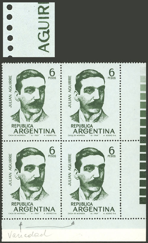 block of 4, one with VARIETY: "G" of AGUIRRE with period, VF (Image)