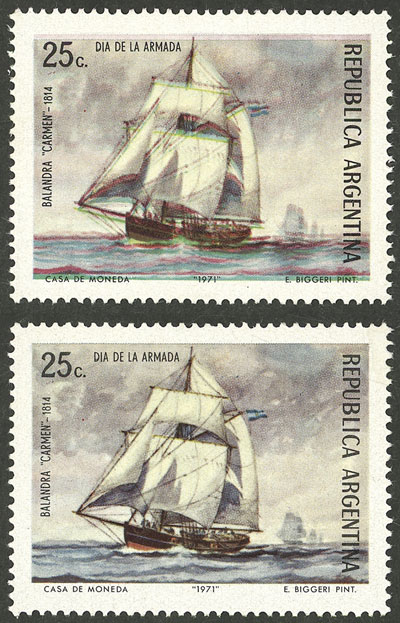 Ship, with VARIETY: shifted colors resembling a double impression, along a normal example (Image)