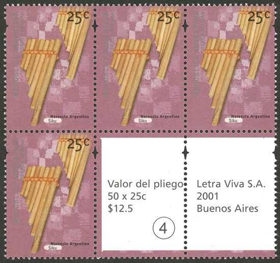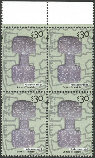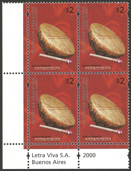 GJ.3095a, $2 Ritual drum, block of 4, stochastic offset, thin paper, opaque gum (Image)