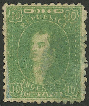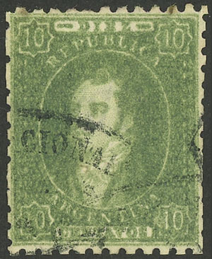10c. worn impression, with FRANCA cancel of San Juan in blue, light crease (Image)