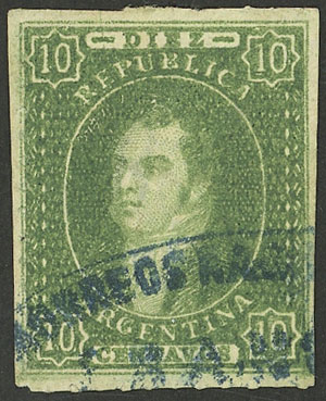 10c. semi-worn impression, TRIPLE cancellation (2 dotted + datestamp of Buenos Aires "S") (Image)