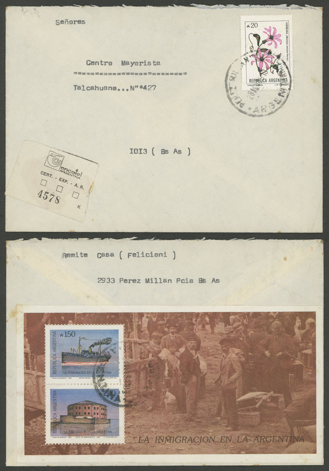 Registered cover with postmark of "PEREZ MILLAN", sent to B.Aires on 28/AU/1989, the postage includes GJ.HB 79 (Immigration, ship) (Image)