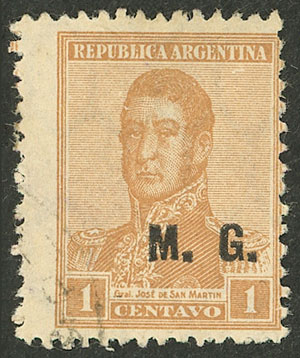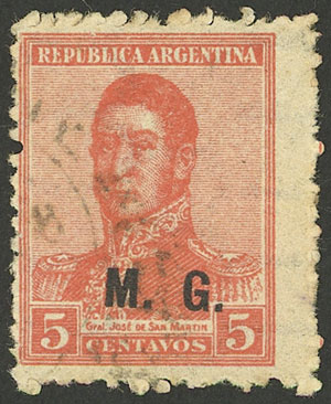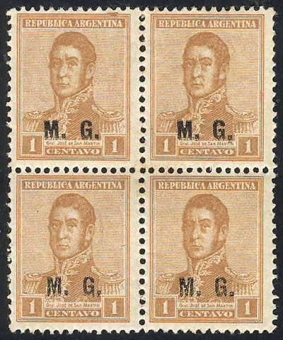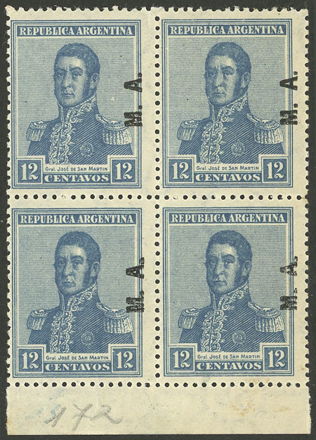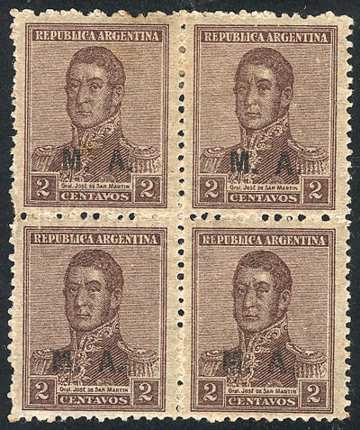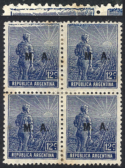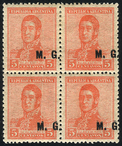 5c San Martín, unwatermarked, perf 13¼ x 12½, block of 4 with shifted overprint variety (Image)