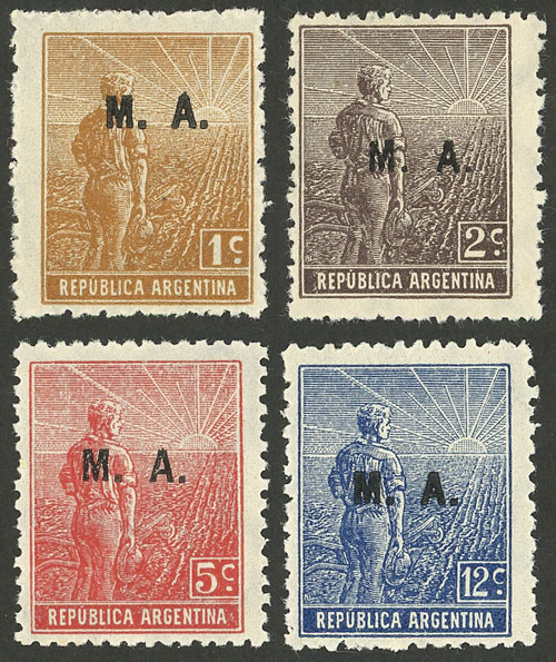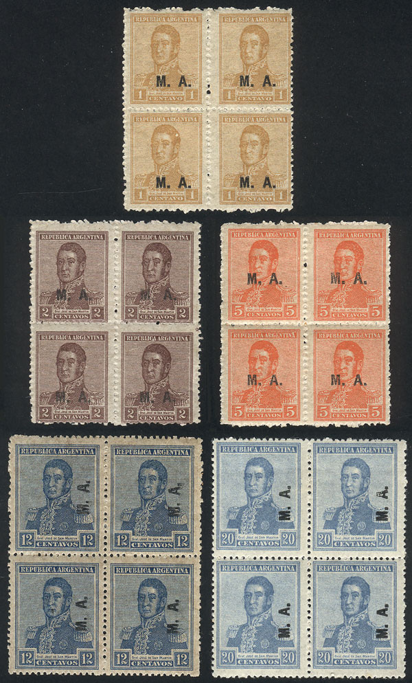 San Martín, unwatermarked, perf 13¼, complete set in blocks of 4, 4 stamps hinged and the rest MNH, VF! (Image)