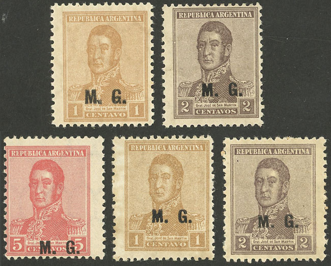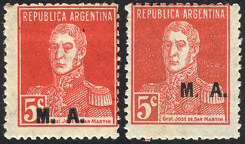 5c. San Martín w/o period, perf 13¼ x 12½, 2 examples printed on DIFFERENT papers, one with overtprint with STRONG downward shift, interesting! (Image)