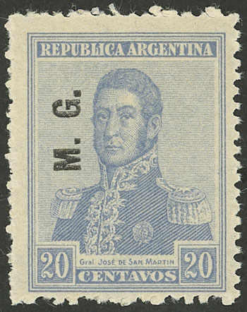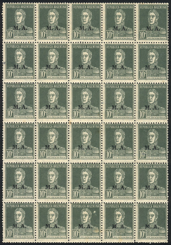 10c. San Martín w/o period, offset, overprint in serif font, large block of 30, the stamp at R6/3 with "white spot" variety, light staining. (Image)