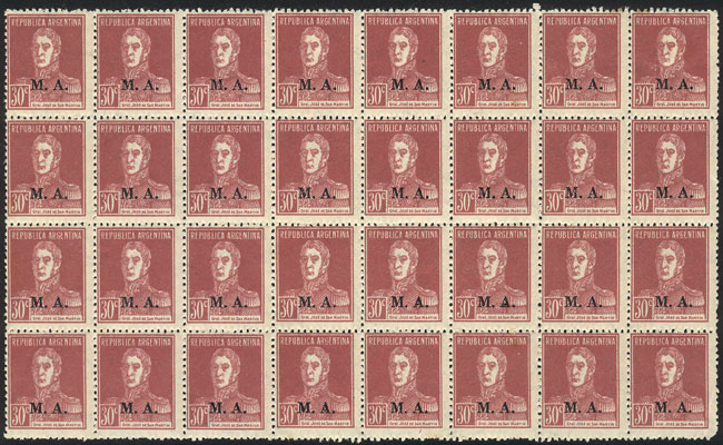 30c. San Martín w/o period, offset, overprint in serif font, large block of 32 stamps, some with stain spots, most MNH. (Image)
