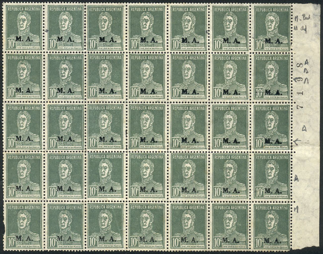 10c. San Martín w/o period, typographed, large marginal block of 35 with a number of varieties, for example: at R1/2 "broken M", at R1/6 "A and period joined", superb!
