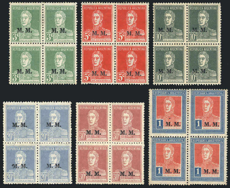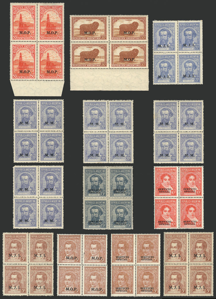 GJ.497/502, cmpl. set in BLOCKS OF 4 with overprint in serif font, mint without gum, some of of the values are very rare in blocks! (Image)