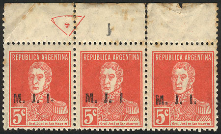 5c San Martín w/o period, perf 13¼ x 12½, marginal strip of 3, one with "I without period" variety, stained (Image)
