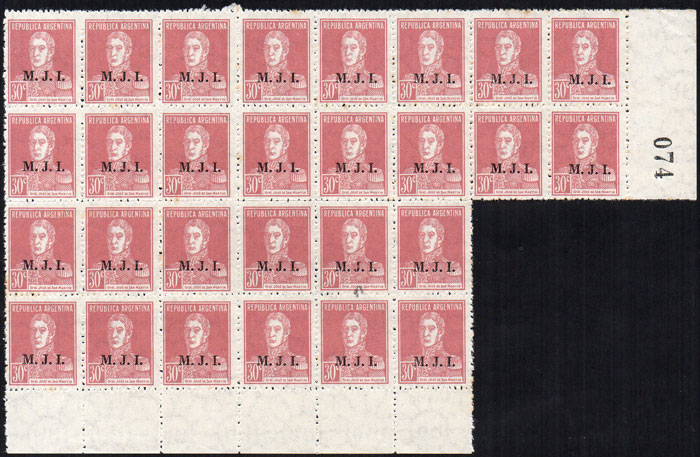 30c San Martín, overprint in serif font, large marginal block of 28 stamps, with light stain spots (Image)
