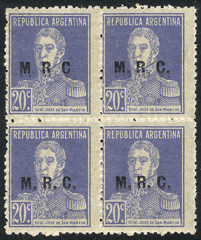 GJ.596c, block of 4, one with VARIETY: "M R C" without periods (Image)