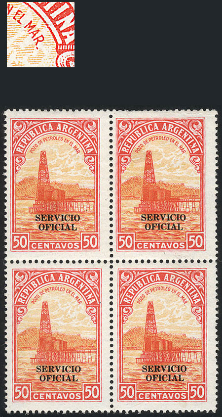50c Petroleum, block of 4, one with "period after MAR" variety, VF! (Image)