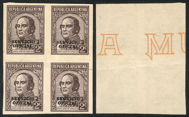 2c. Urquiza, block of 4, PROOF on special paper for specimens with glazed front, in the issued color gray-chestnut (1958 Kneitschel, volume II, page 753), VF quality!