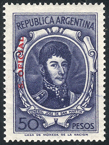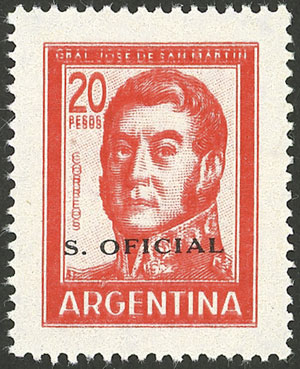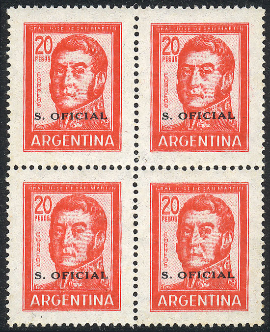$20 San Martín, round sun wmk, block of 4 with DOUBLE IMPRESSION, showing some stain spots, good front. (Image)