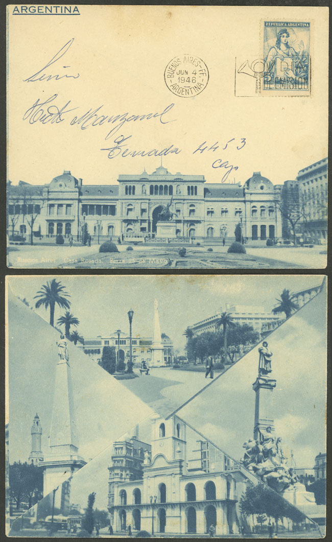 4/JUN/1946, Cover with different printed views of Mayo square (on front and back), franked with 5c. (GJ.928, first day of issue) (Image)