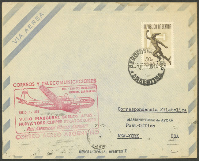 FLIGHT: Cover flown by Pan American on the first Buenos Aires - New York flight of 7/JUL/1950 on a Clipper Stratocruiser (Image)
