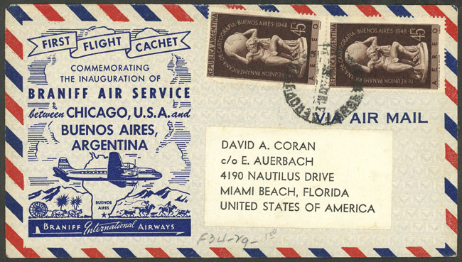 FLIGHT: Cover flown by Braniff on the first Buenos Aires - Chicago flight of 3/MAY/1950, with special cachet (Image)