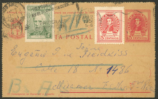 Lettercard uprated with 9c., sent from Buenos Aires to Miramar on 2/AP/1951, returned to sender (Image)