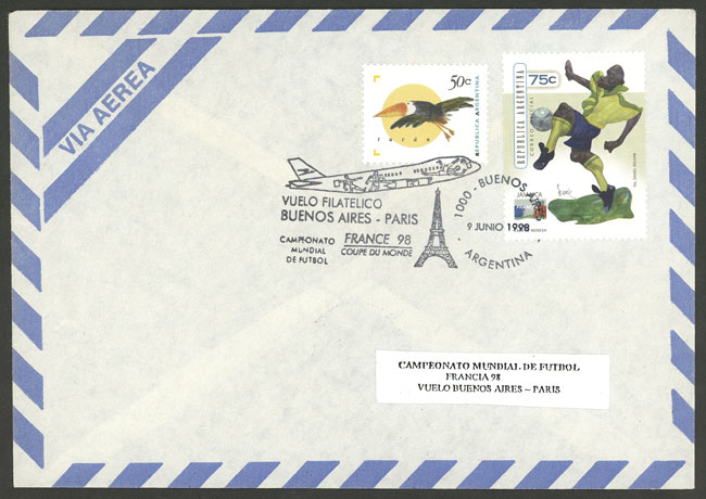 flown from Buenos Aires to Paris on 9/JUN/1998, with commemorative postmark for France 98 Football World Cup (Image)