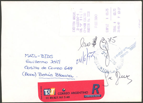 sent from Salta to Bahía Blanca on 21/JUN/1997, franked $2.75 with printed receipt, rare! (Image)