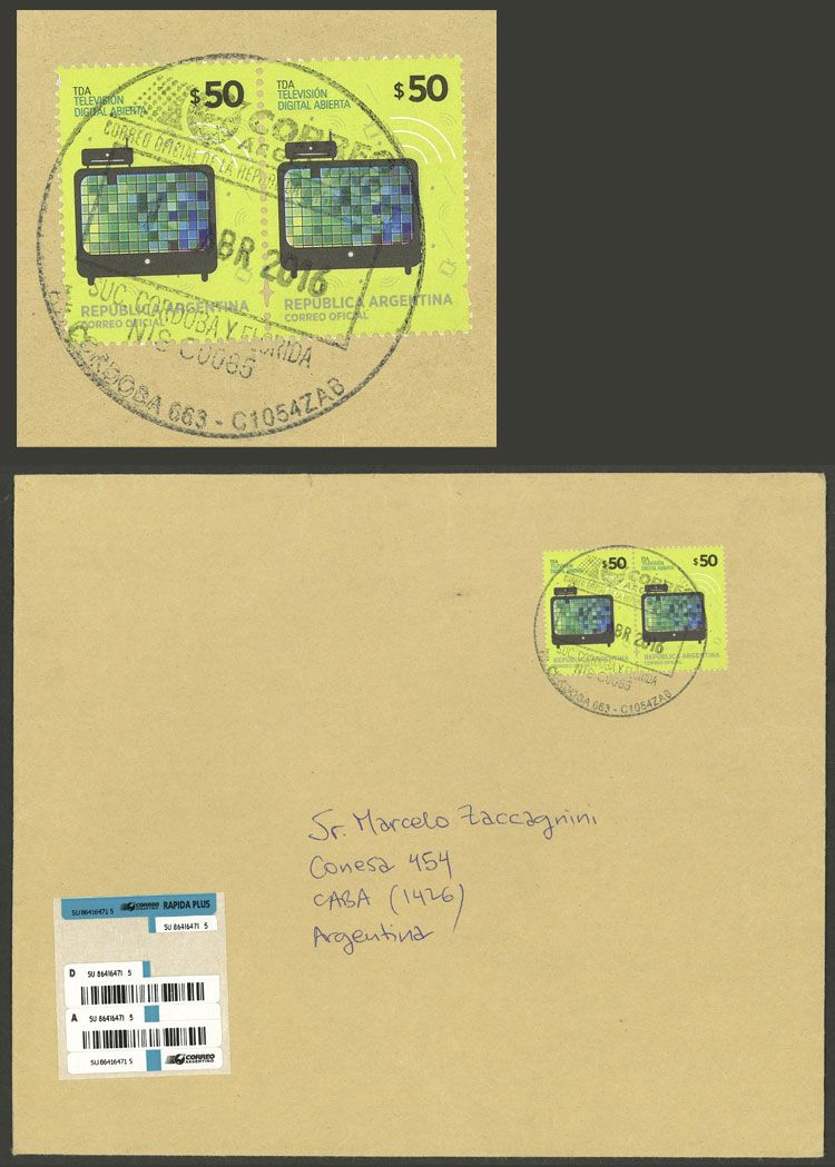 used in B.Aires in AP/2016, franked with $100 (GJ.4019 in pair), sent by "RAPIDA PLUS" mailing service (Image)