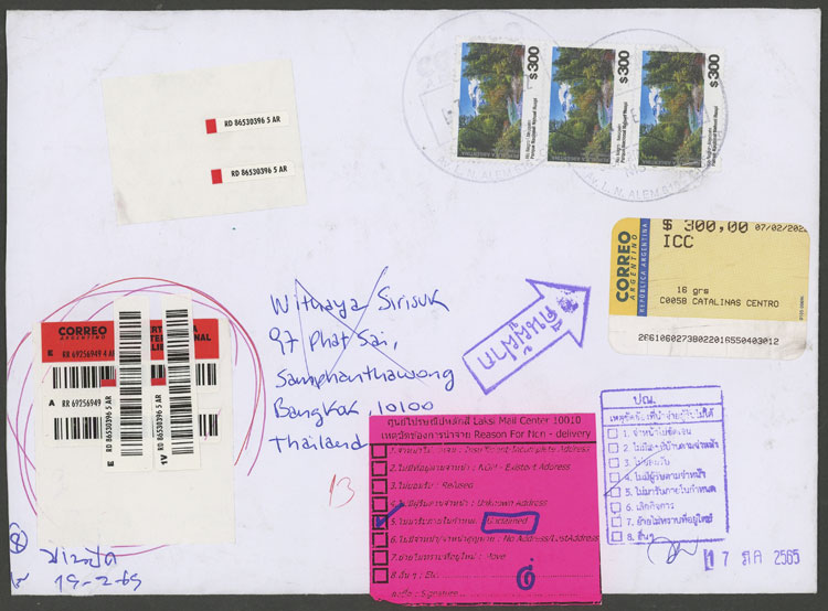 sent from B.Aires to Thailand on 7/FE/2002, franked with $1200 (GJ.4300 x3 + variable value stamp), returned to sender (Image)