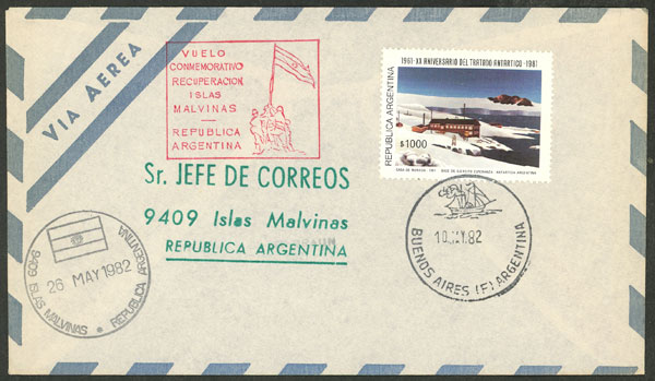 sent from Buenos Aires to Islas Malvinas on 10/MAY/1982, with special handstamp "Vuelo Conmemorativo Recuperación Islas Malvinas" (Image)
