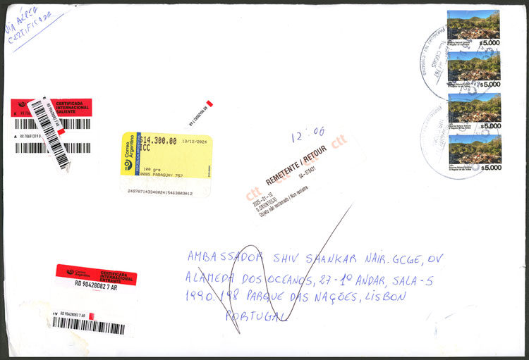 Registered airmail cover sent from Buenos Aires to Portugal on 13/DE/2024, franked with $34,300, including GJ.4510 x4, with vertical crease not affecting the stamps, good postage (Image)