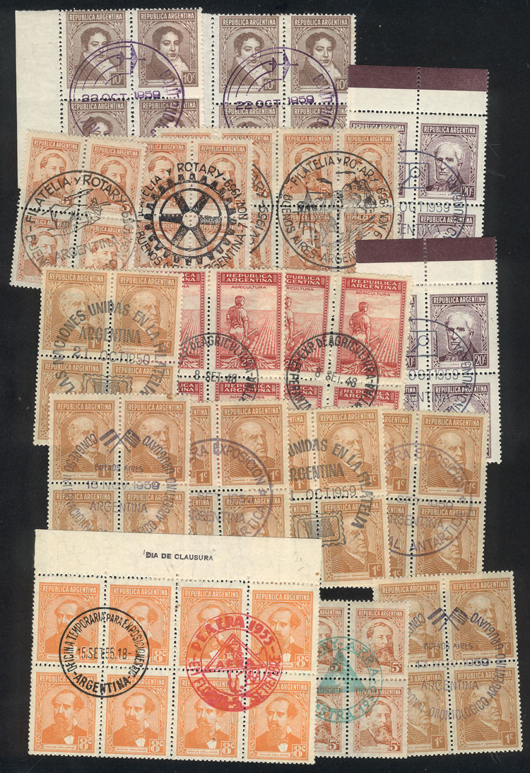 19 blocks of 4 of stamps of Proceres & Riquezas issue, with cancels of different events, very nice (Image)