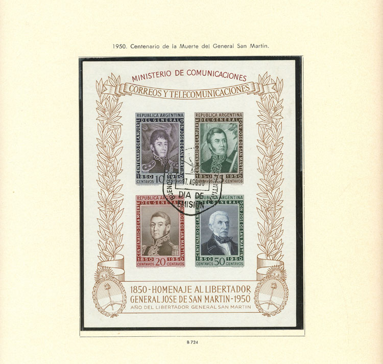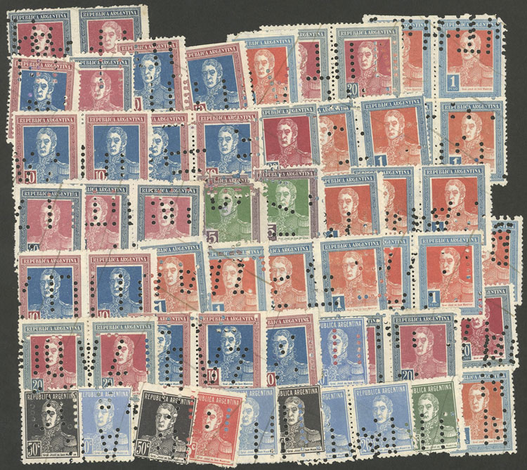 over 50 San Martin stamps with invalidating perforations, fine general quality (Image)