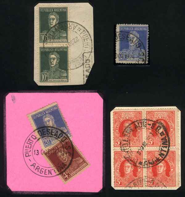 stamps + 1 pair + 1 block of 4 (some on fragment), all with cancels of PUERTO DESEADO (Santa Cruz), VF! (Image)